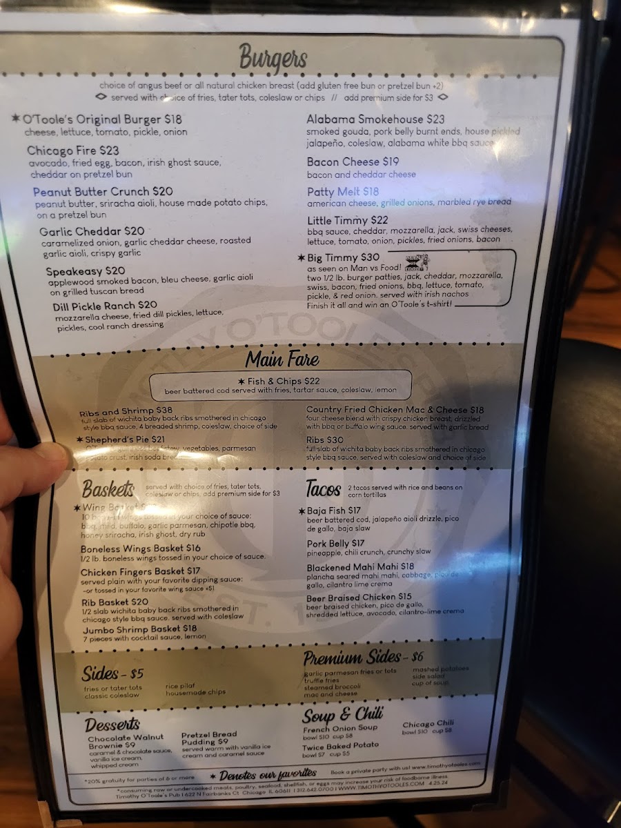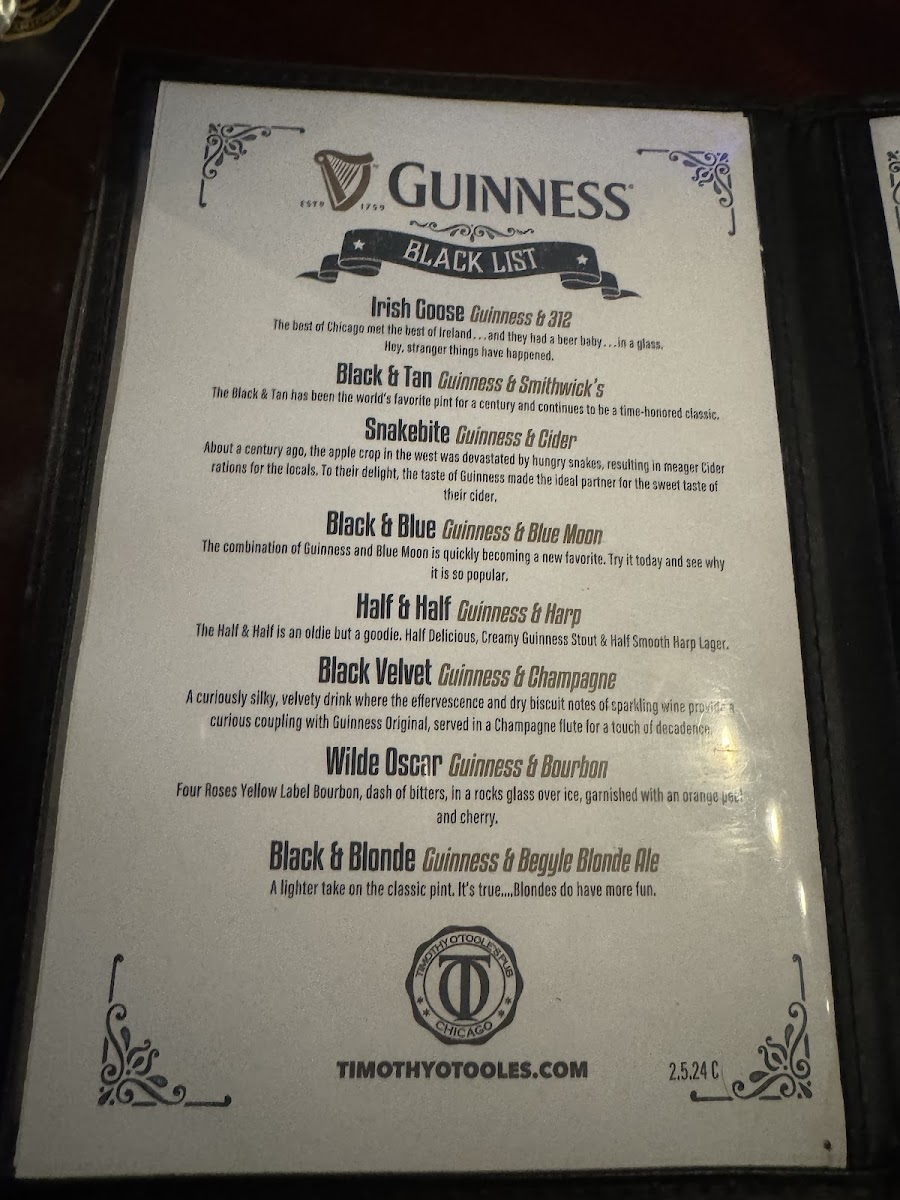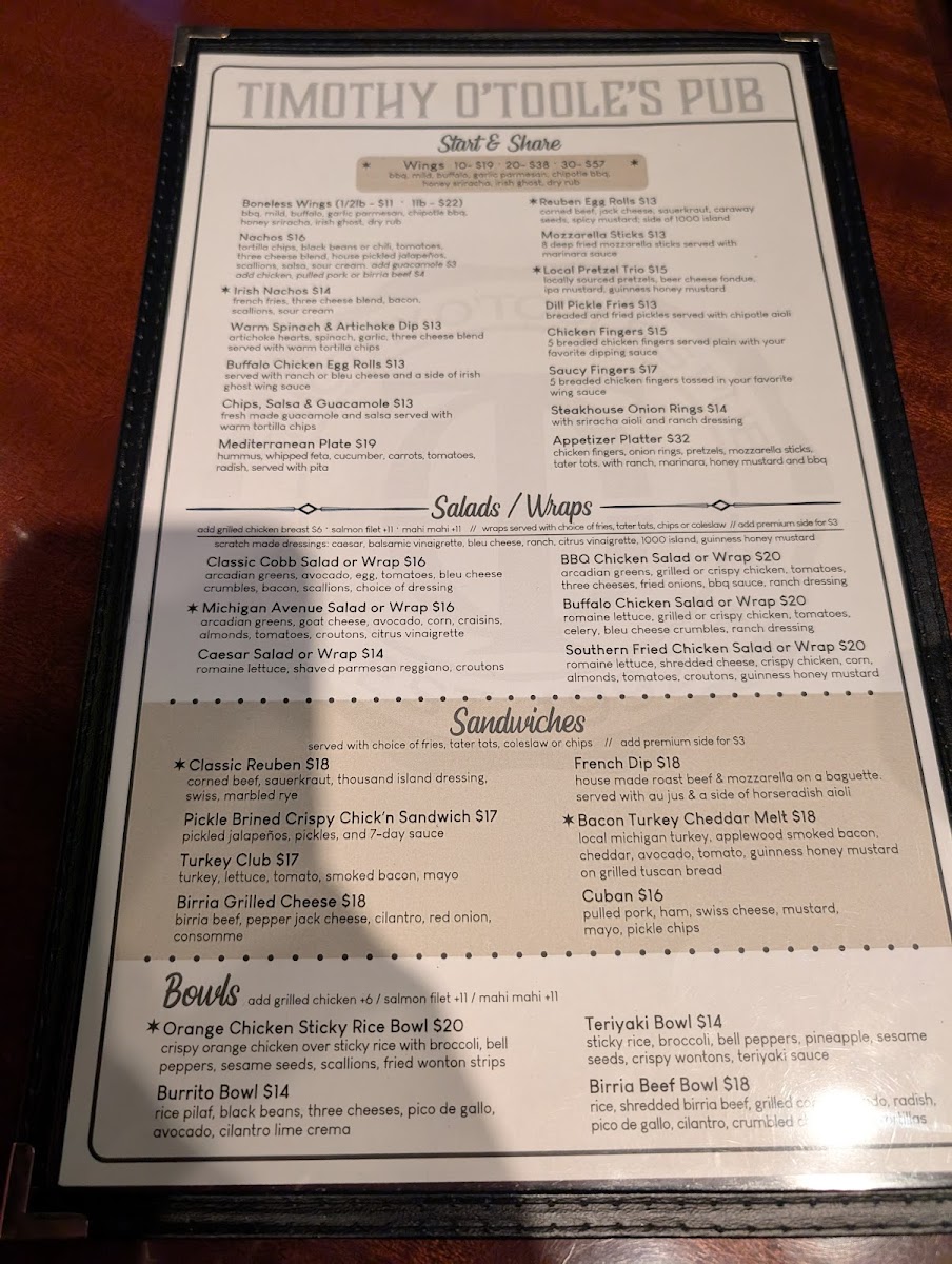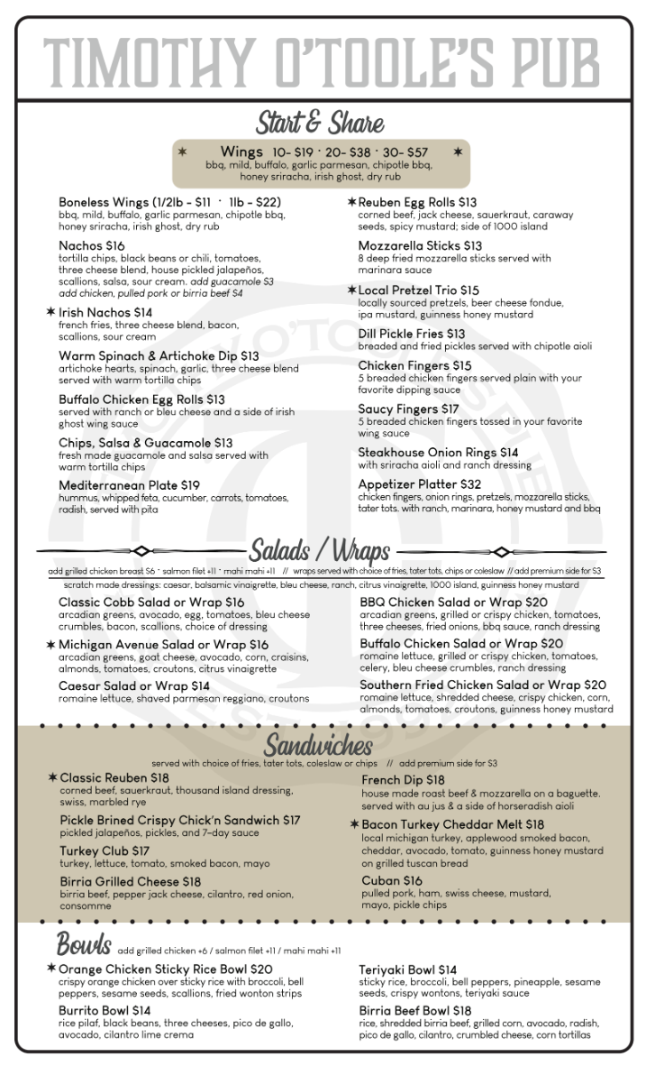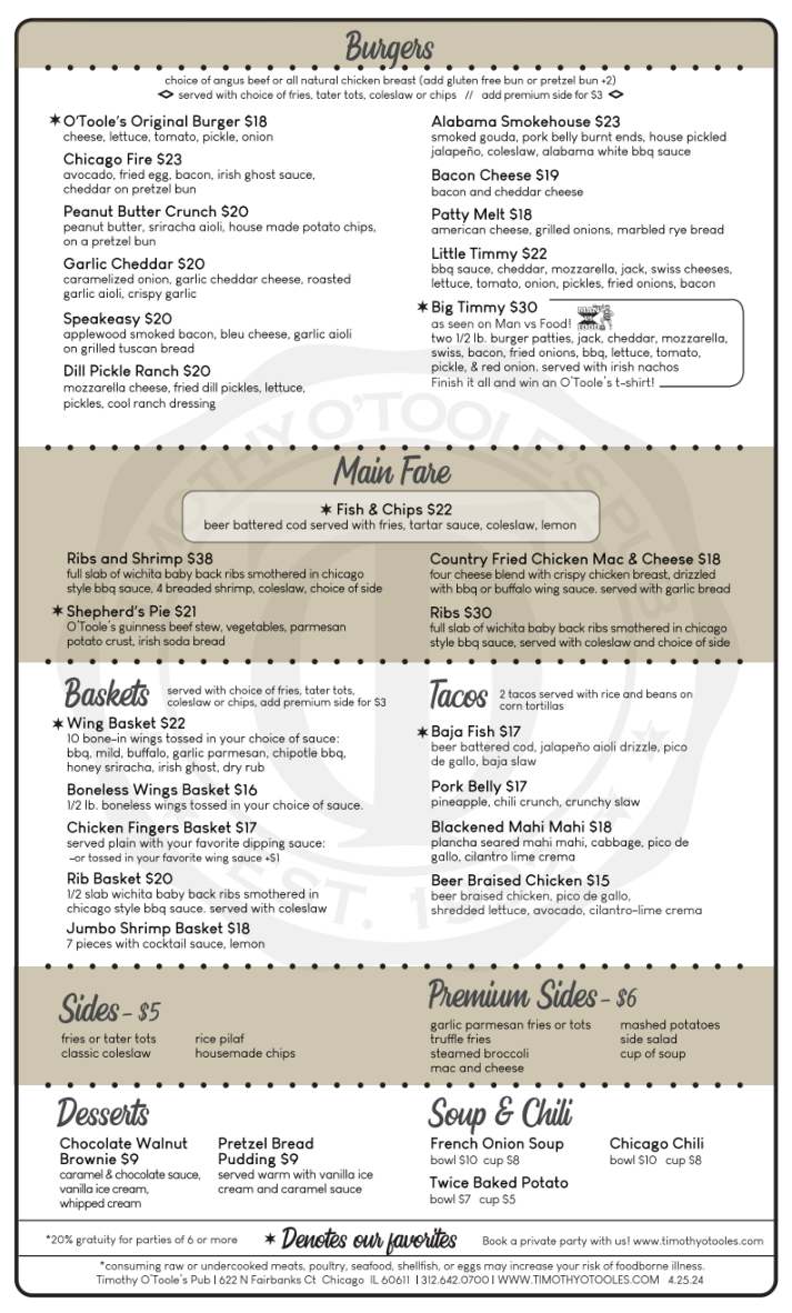 Timothy O'Toole's Pub Chicago Menu